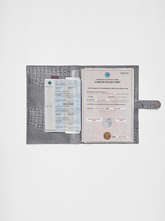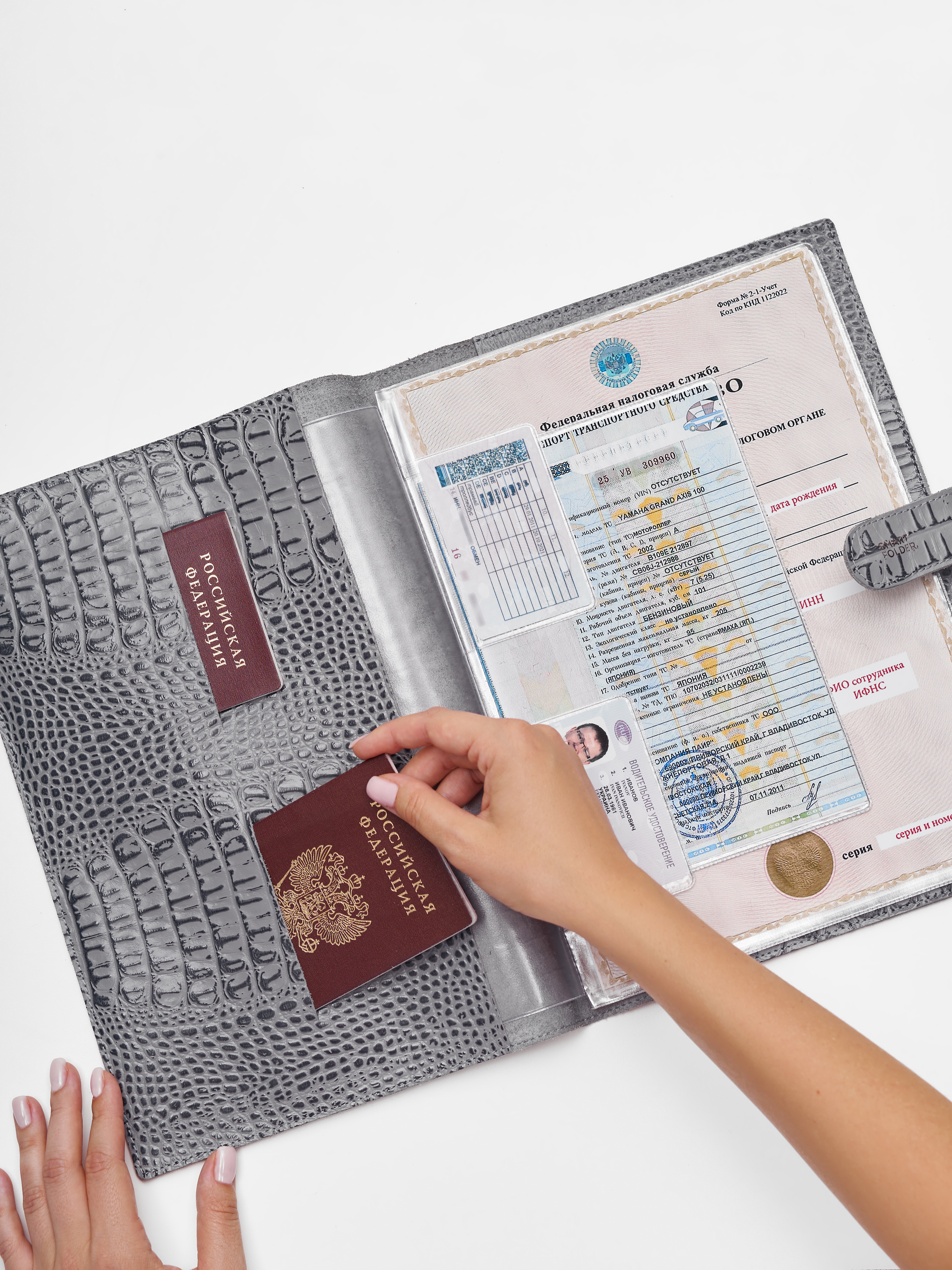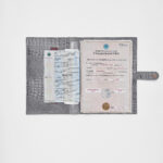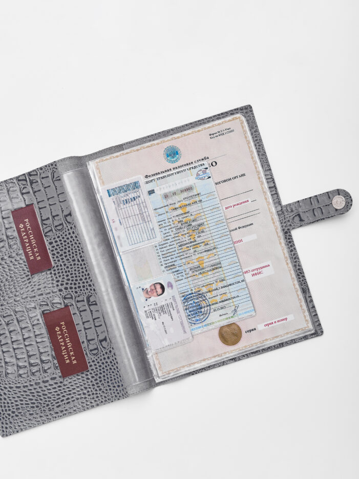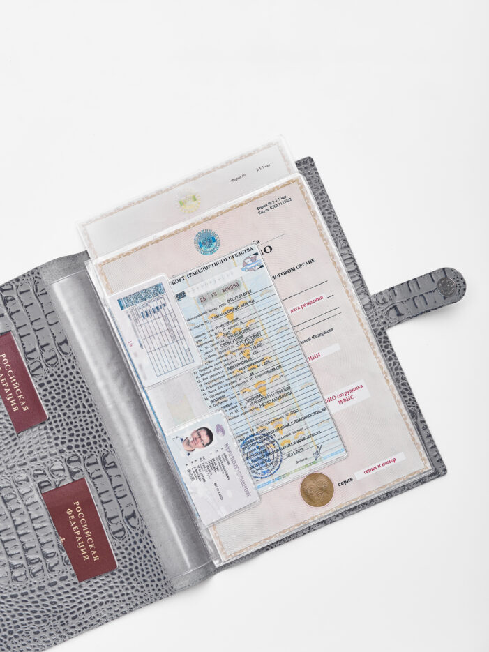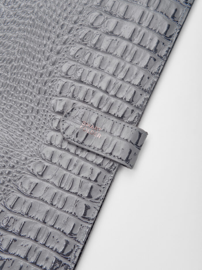 Папка для хранения документов в сером цвете. В папку с файлами а4 поместится комплект документов на четырех человек: паспорта, детские свидетельства о рождении, дипломы и многое другое. Папка для документов семейная Smart Folder поможет бережно хранить личные документы вдали от посторонних глаз, а так же оперативно взять все необходимое в случае форс-мажора (пожар, наводнение и т.д.). Кроме того, дорожный органайзер с кармашками поможет упорядочить документы в отпуске и путешествии. Обложка папки изготовлена из мягкой натуральной кожи высочайшего качества с потрясающей фактурой под крокодила. Натуральная кожа — это надежный, безопасный и более долговечный материал, чем экокожа, резина или пластик, она позволит вам с удовольствием пользоваться аксессуаром, изготовленными из этого материала, долгие годы.
