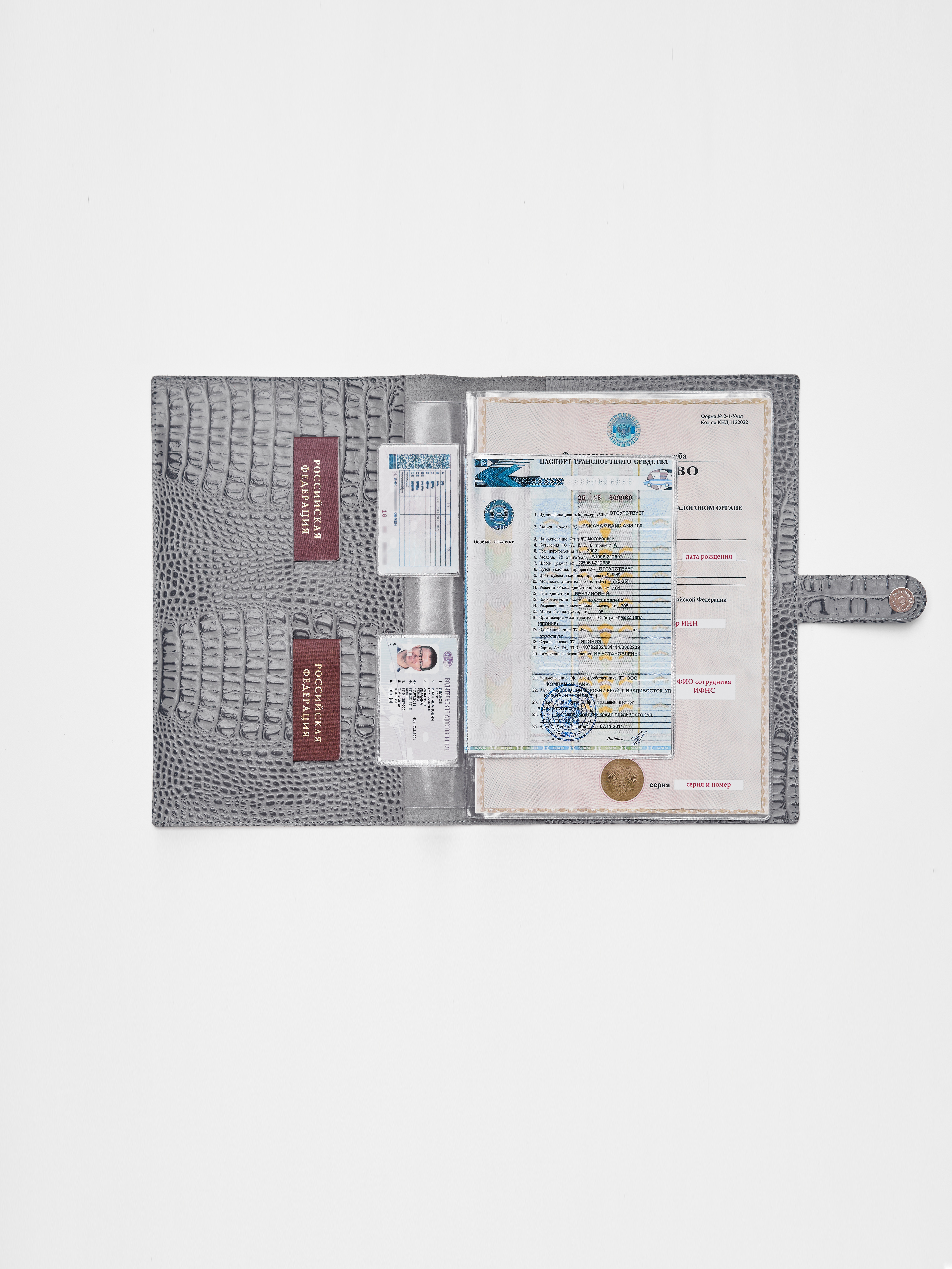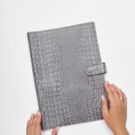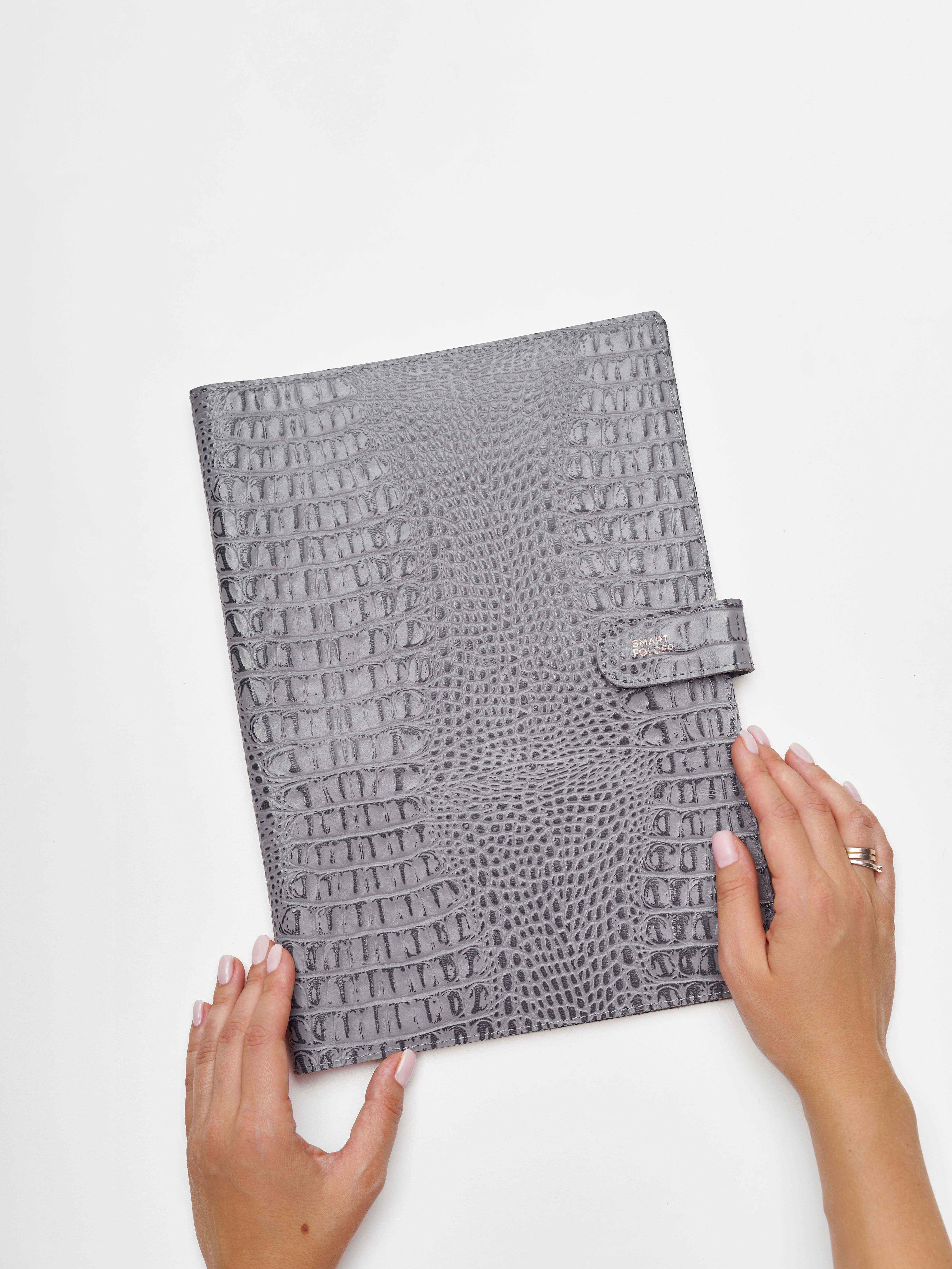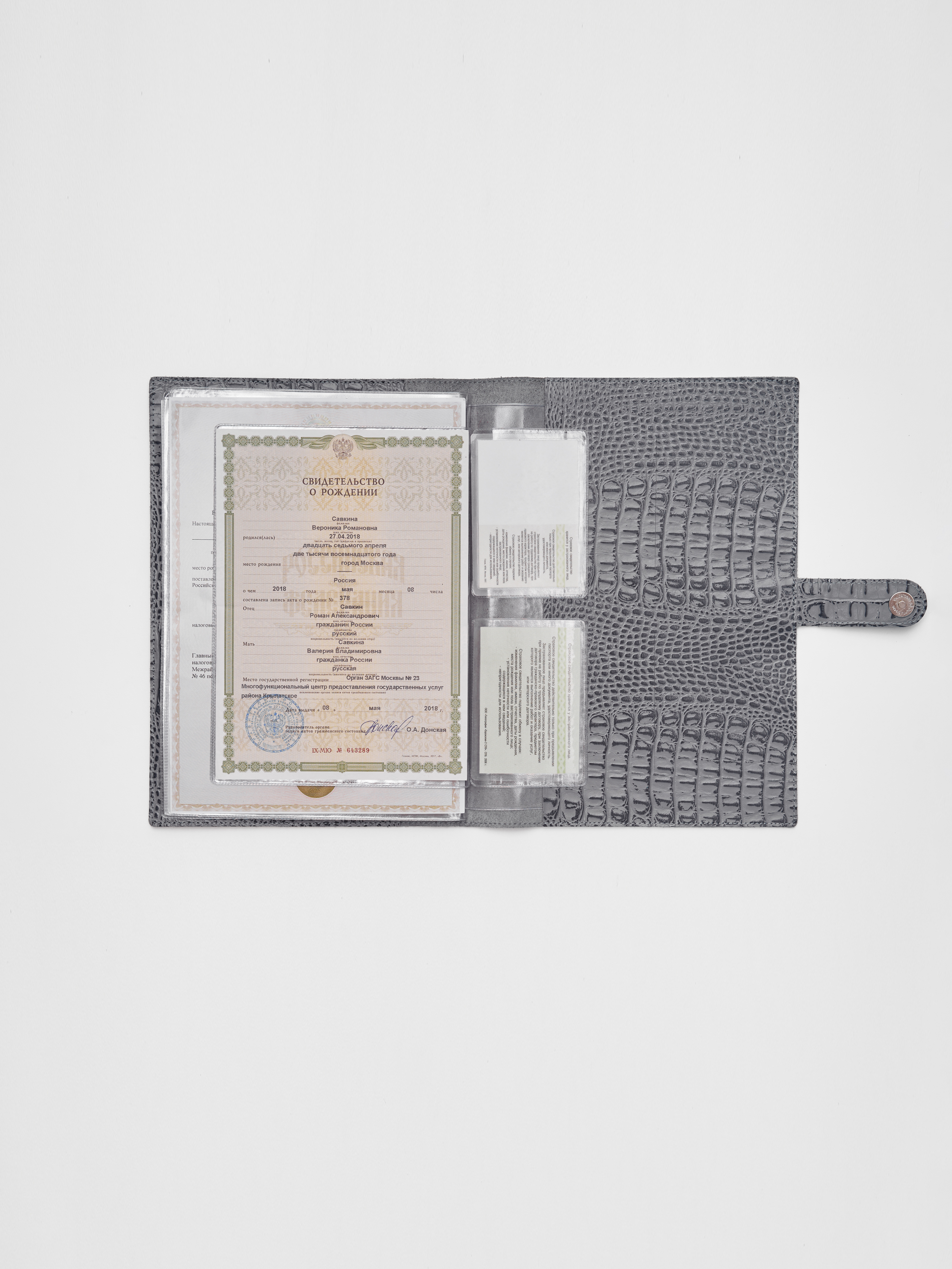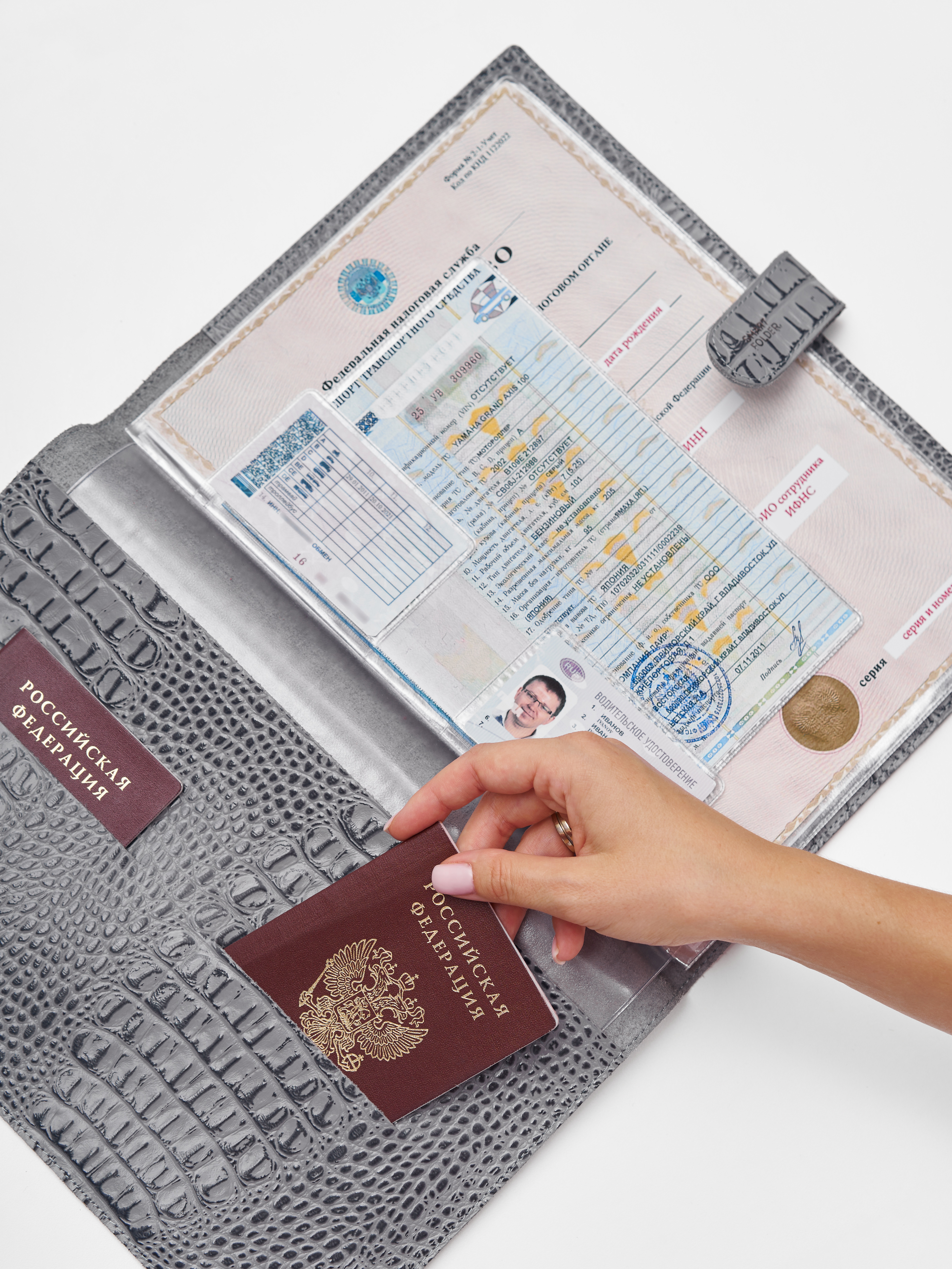 Папка для хранения документов в сером цвете. В папку с файлами а4 поместится комплект документов на четырех человек: паспорта, детские свидетельства о рождении, дипломы и многое другое. Папка для документов семейная Smart Folder поможет бережно хранить личные документы вдали от посторонних глаз, а так же оперативно взять все необходимое в случае форс-мажора (пожар, наводнение и т.д.). Кроме того, дорожный органайзер с кармашками поможет упорядочить документы в отпуске и путешествии. Обложка папки изготовлена из мягкой натуральной кожи высочайшего качества с потрясающей фактурой под крокодила. Натуральная кожа — это надежный, безопасный и более долговечный материал, чем экокожа, резина или пластик, она позволит вам с удовольствием пользоваться аксессуаром, изготовленными из этого материала, долгие годы.